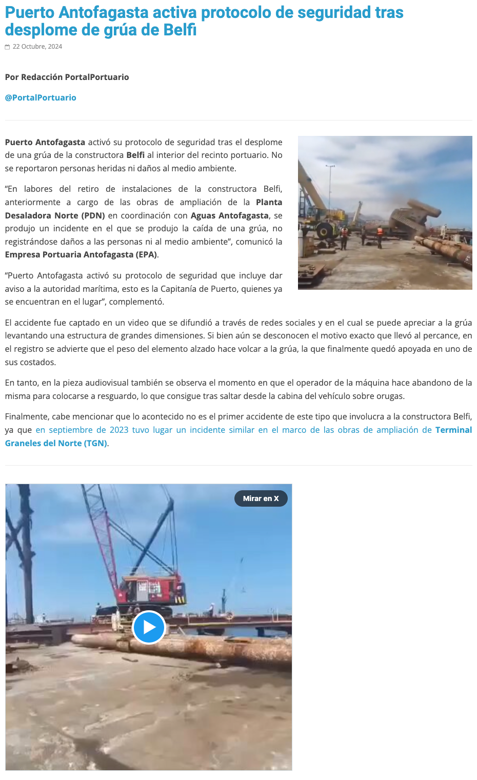Grúa colapsó en plena faena en el puerto de Antofagasta: trabajador resultó ileso - (El Mercurio de Antofagasta)