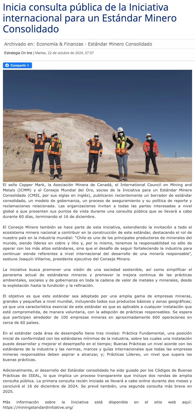 Inicia consulta pública de la Iniciativa internacional para un Estándar Minero Consolidado - (portalinnova.cl)