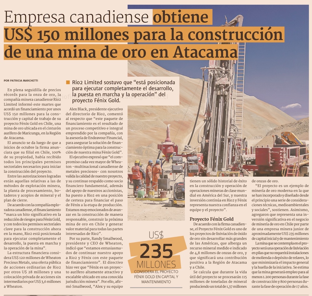 Canadiense Rio2 cierra financiamiento para faena aurífera en Chile - (El Mercurio de Santiago)