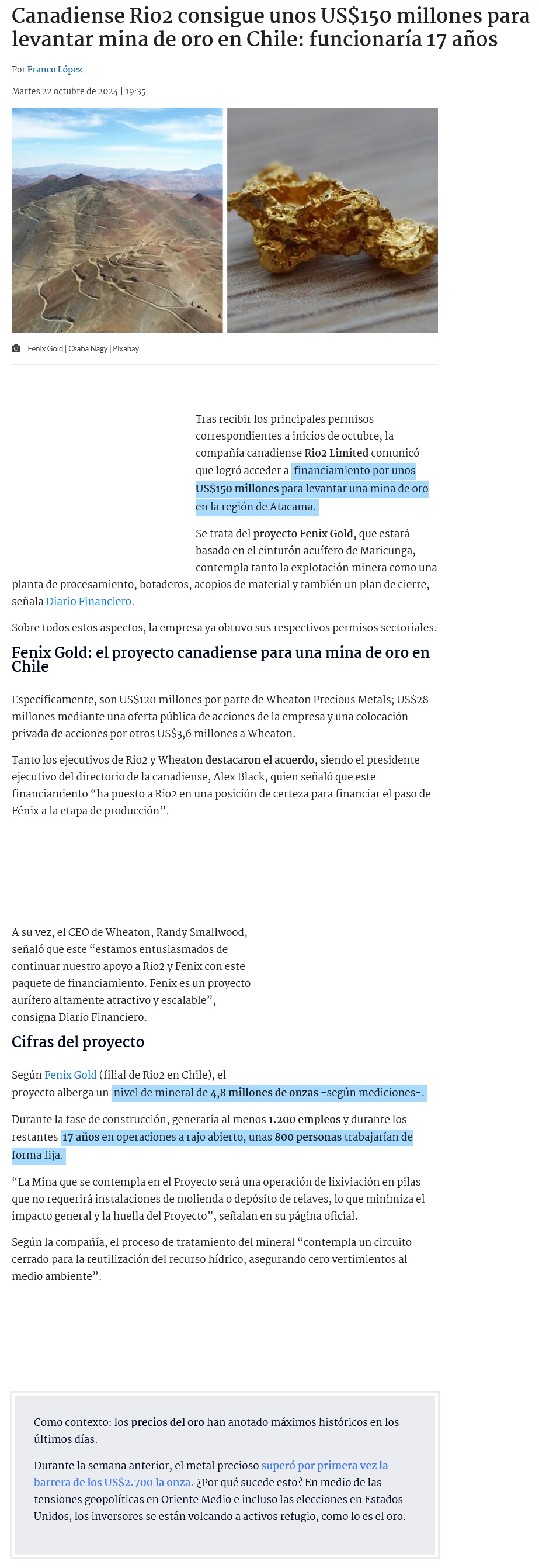 Atacama: anuncian financiamiento para proyecto Fenix Gold por US$150 millones que busca levantar una mina de oro - (El Diario de Atacama)