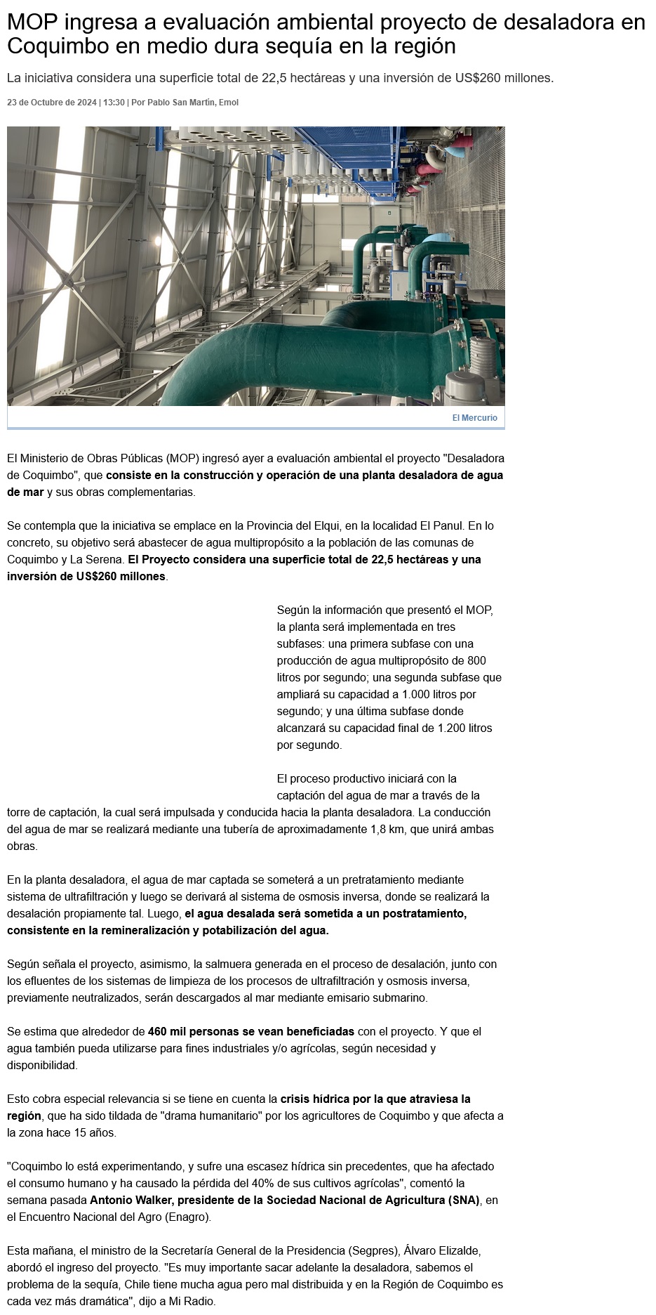 MOP ingresa a evaluación ambiental proyecto para construir desaladora en Coquimbo por US$260 millones - (Pulso)