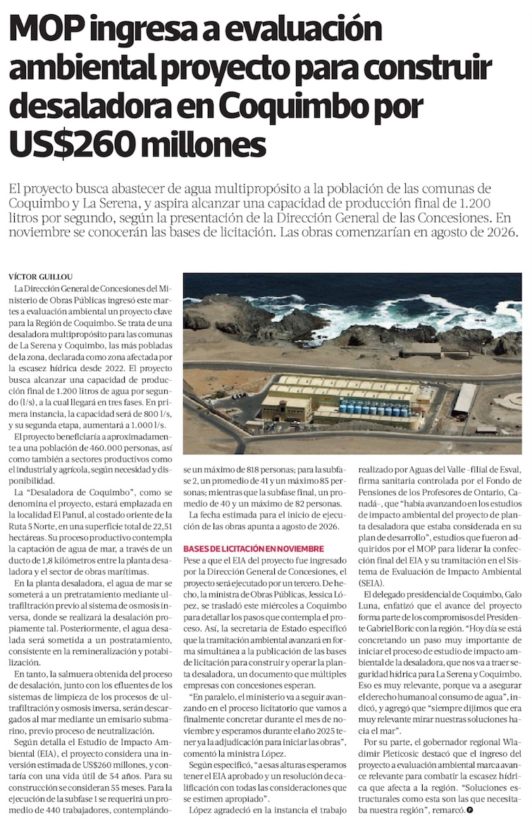 MOP ingresa a evaluación ambiental proyecto de desaladora en Coquimbo en medio dura sequía en la región - (emol)
