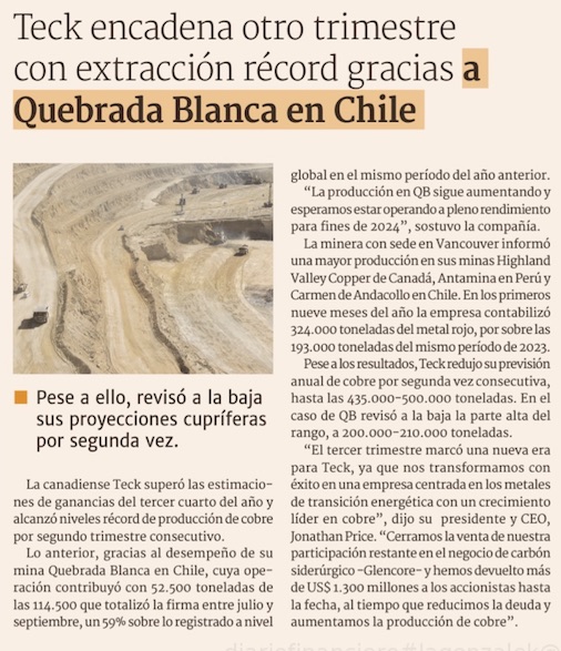 Quebrada Blanca producirá más de 200 mil toneladas de cobre este año - (El Mercurio de Santiago)