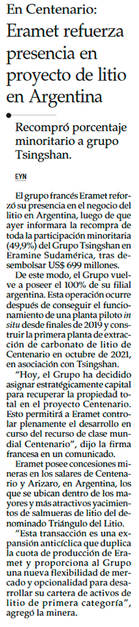 Siguen compras en mercado del litio en Argentina: Eramet controla el 100% de su negocio, tras pago de US$699 millones a Tsingshan - (Pulso)