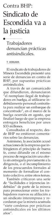 Sindicato de Escondida presenta acciones por prácticas desleales y antisindicales - (El Mercurio de Calama)