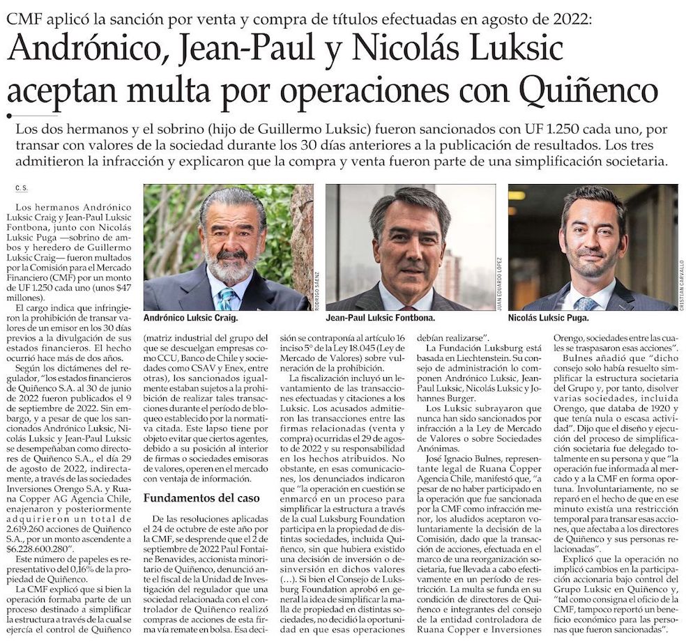 CMF multa a Andrónico, Jean Paul y Nicolás Luksic por venta de acciones de Quiñenco en periodo de bloqueo - (Diario Financiero)