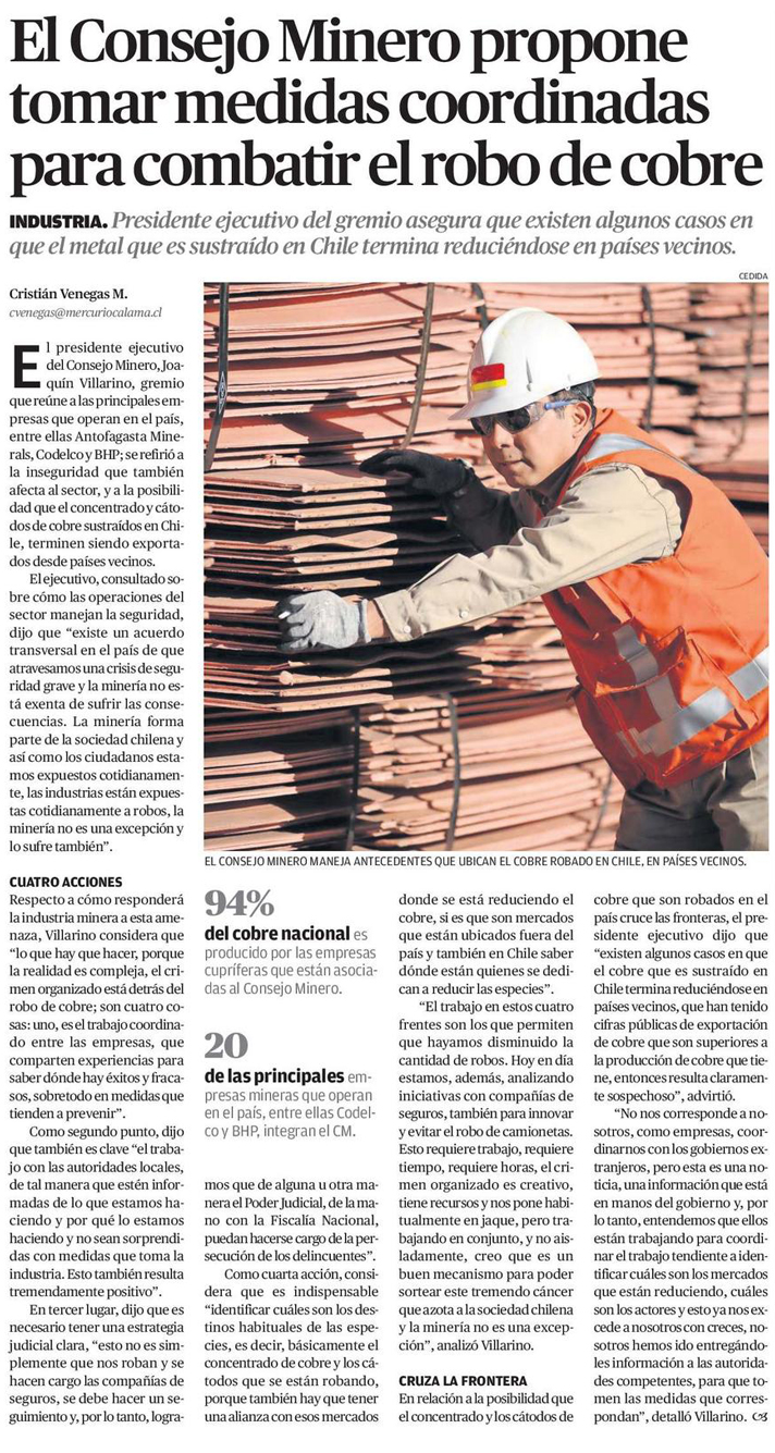 El Consejo Minero propone tomar medidas coordinadas para combatir el robo de cobre - (El Mercurio de Calama)