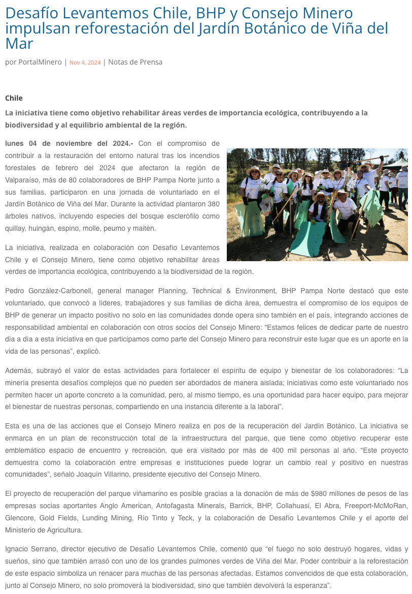 Desafío Levantemos Chile, BHP y el Consejo Minero impulsan reforestación del Jardín Botánico de Viña del Mar - (epanews.cl)