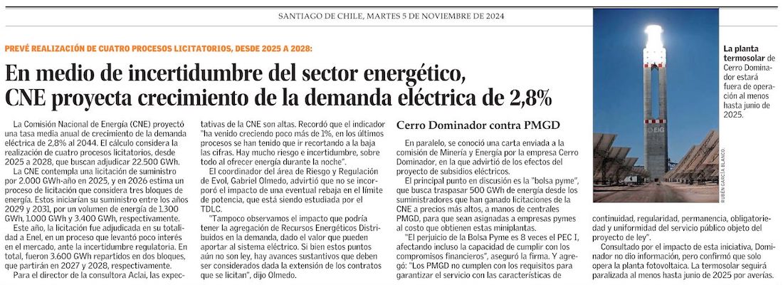 CNE anticipa volumen de energía que se licitará en 2025 y traza nuevos procesos para años venideros - (Diario Financiero)