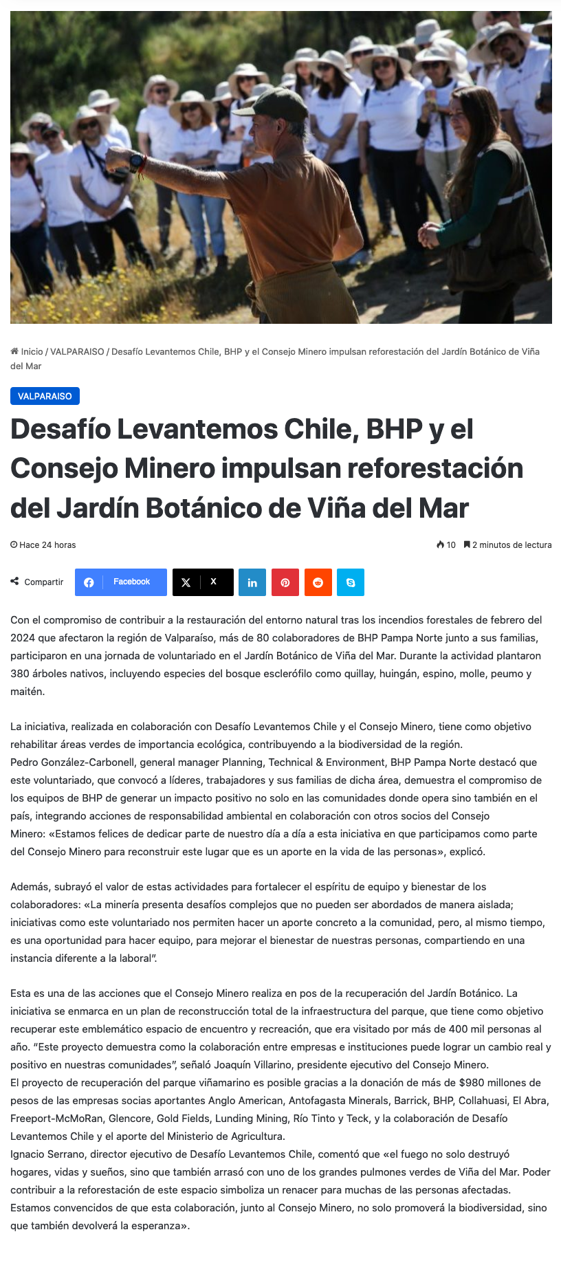 Desafío Levantemos Chile, BHP y el Consejo Minero impulsan reforestación del Jardín Botánico de Viña del Mar - (epanews.cl)