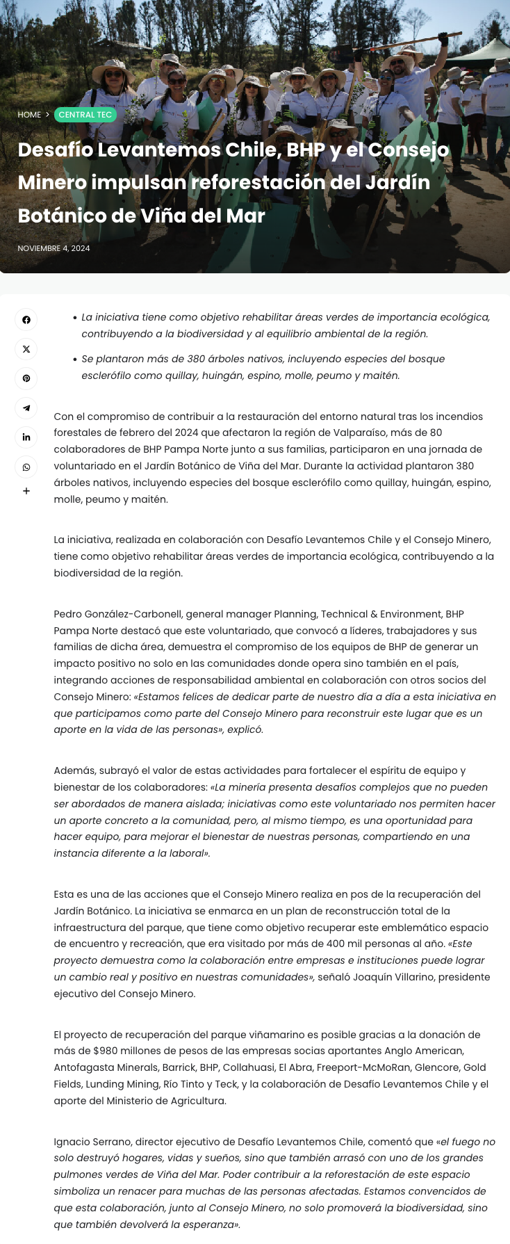 Desafío Levantemos Chile, BHP y el Consejo Minero impulsan reforestación del Jardín Botánico de Viña del Mar - (epanews.cl)