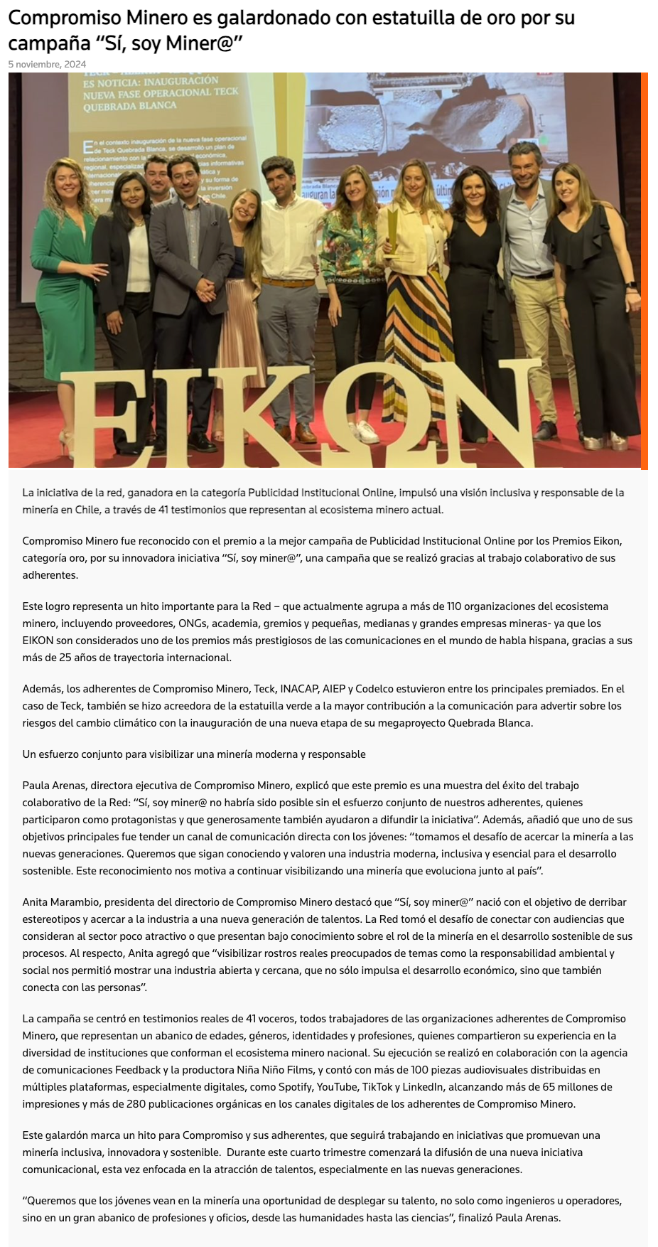Compromiso Minero es galardonado en la 6° edición de los Premios Eikon 2024 - (mch.cl)
