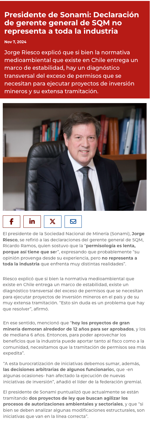 Sonami rebate a SQM por frase de “permisología”: “No representa a toda la industria” - (El Mercurio de Santiago)
