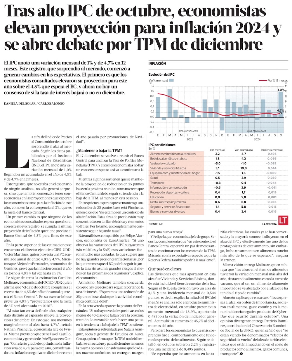 Alto IPC de octubre pone presión al Banco Central: mercado sube proyección para fin de año y advierte “efectos de segunda vuelta” en inflación - (Diario Financiero)