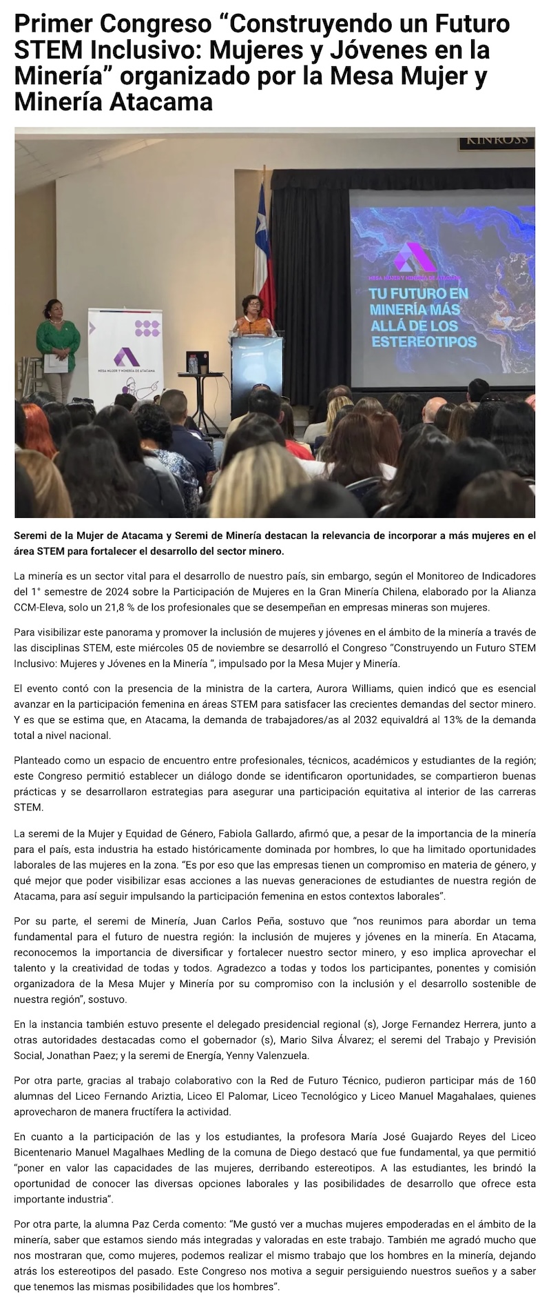 Primer Congreso "Construyendo un Futuro STEM Inclusivo: Mujeres y Jóvenes en la Minería" organizado por la Mesa Mujer y Minería Atacama - (rtnoticias.cl)