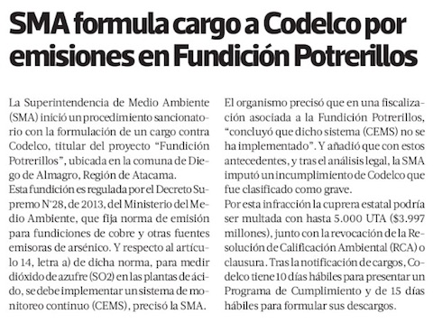 SMA inicia proceso sancionatorio contra Codelco Potrerillos - (El Diario de Atacama)