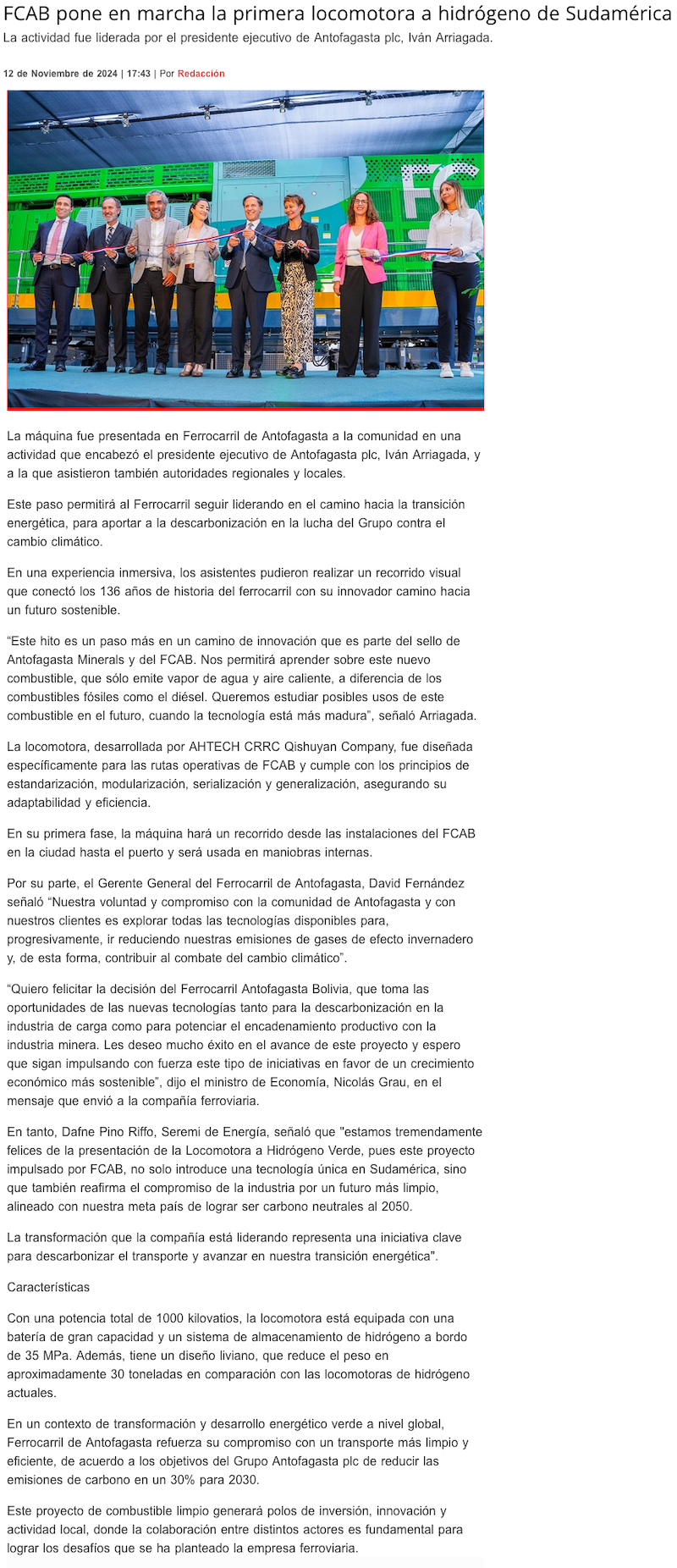 FCAB pone en marcha primera locomotora propulsada con hidrógeno verde de Sudamérica - (El Mercurio de Antofagasta)