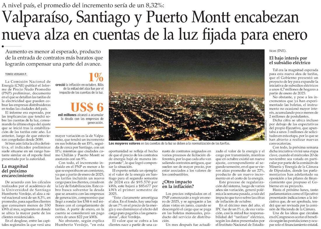 CNE ratifica nueva alza en cuentas de luz en enero de 2025 y proceso de normalización sumaría aumento total de más del 50% - (Diario Financiero)