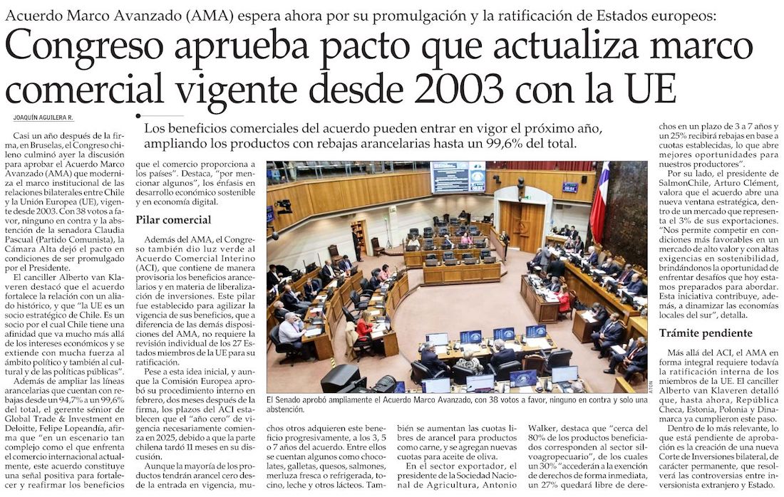 Acuerdo avanzado Chile-UE supera su último paso y es ratificado por el Senado - (Diario Financiero)