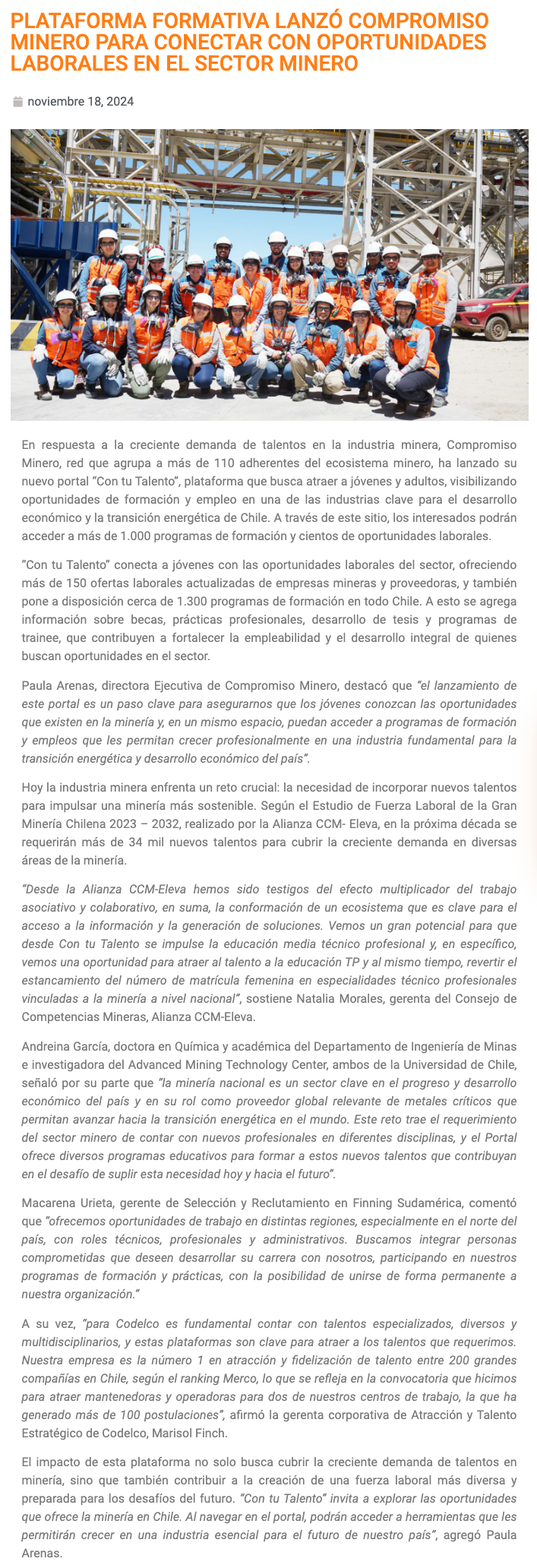 “Con tu talento”: Compromiso Minero lanza plataforma formativa y laboral para conectar a jóvenes y adultos con oportunidades en minería - (infogate.cl)