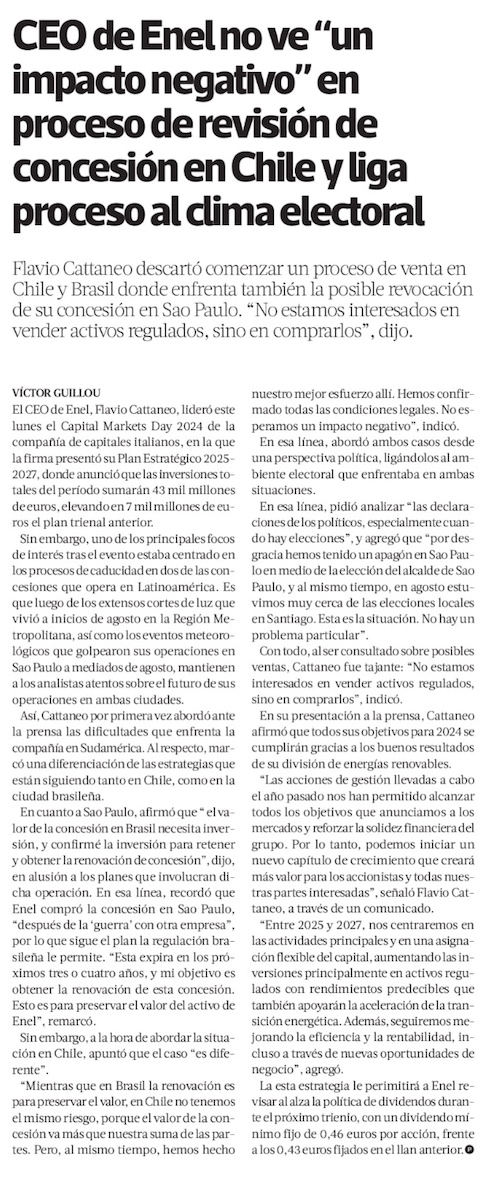 CEO de Enel y caducidad de la concesiones en Chile” No esperamos un resultado negativo” - (Diario Financiero)