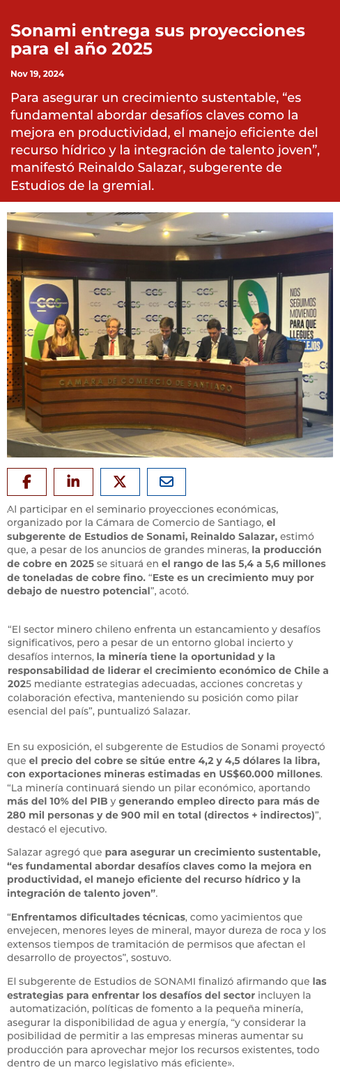 Sonami realiza proyecciones para 2025: El precio del cobre fluctuará entre 4,2 y 4,5 dólares la libra - (soyantofagasta)
