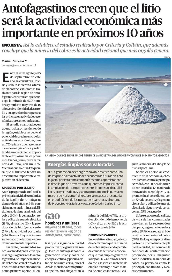Estudio Criteria-Colbún: Litio y energías renovables lideran expectativas para los próximos 10 años en Antofagasta - (soyantofagasta)