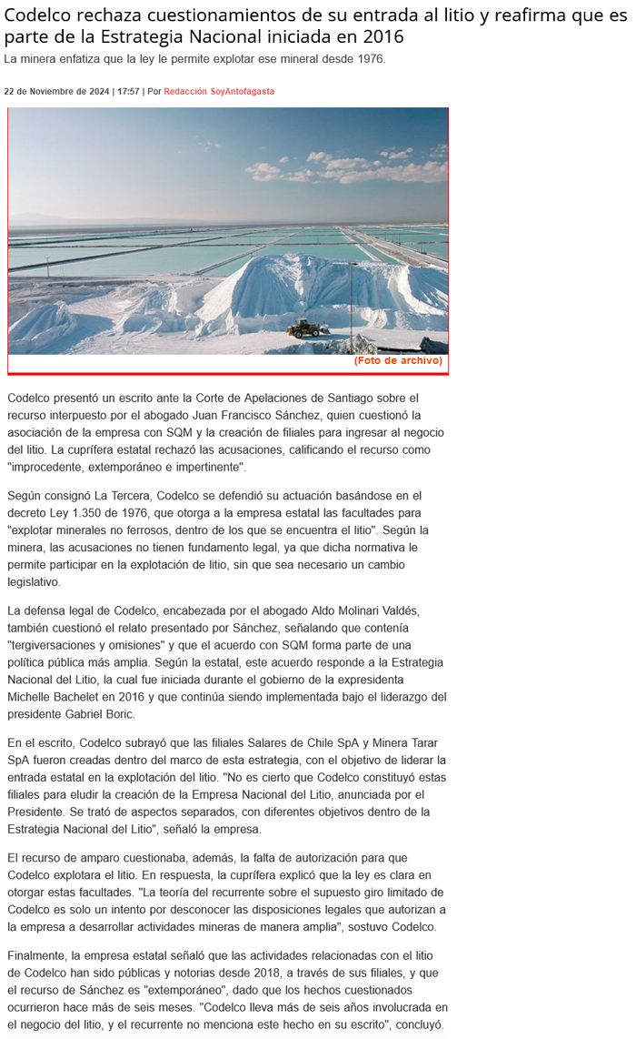 Codelco afirma que el decreto ley de 1976 la autoriza a explotar el litio - (Pulso)