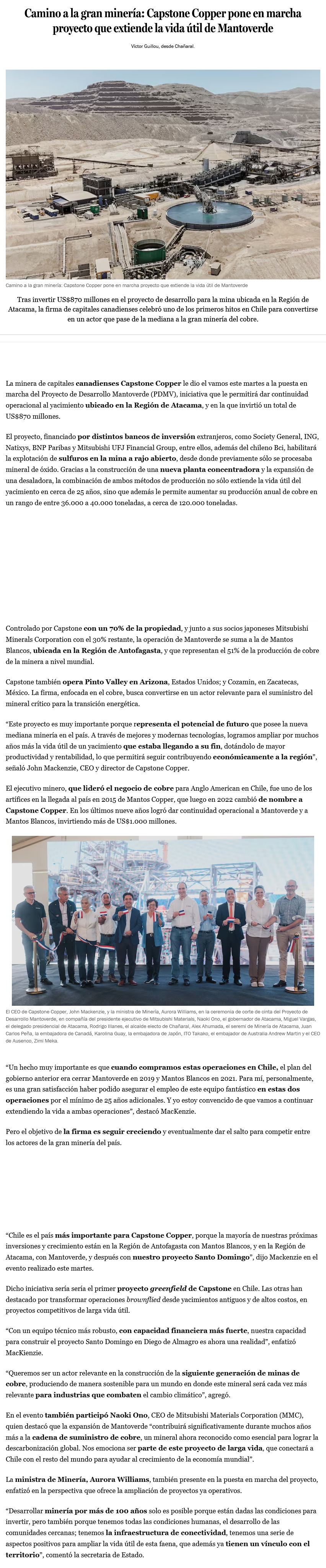 Camino a la gran minería: Capstone Copper pone en marcha proyecto que extiende la vida útil de Mantoverde - (Pulso)