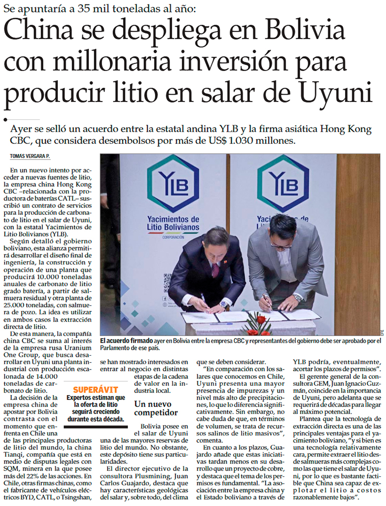 Bolivia firma contrato de más de US$1.030 millones con consorcio chino para proyecto de litio - (La Tercera Online)