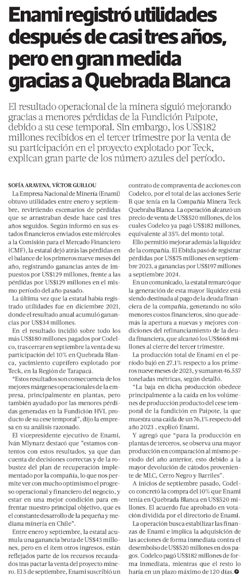 Enami evita pérdidas con venta de participación en Quebrada Blanca - (El Mercurio de Santiago)