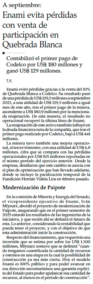 Enami revierte pérdidas a septiembre tras venta de participación en Quebrada Blanca - (Diario Financiero)