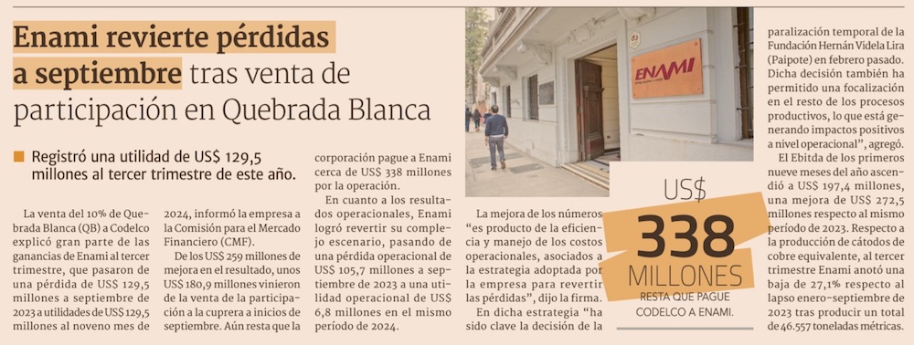 Enami evita pérdidas con venta de participación en Quebrada Blanca - (El Mercurio de Santiago)