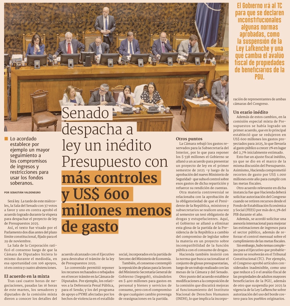 Tras despacho del presupuesto 2025, Gobierno alista ingreso de recurso al T. Constitucional - (El Mercurio de Santiago)