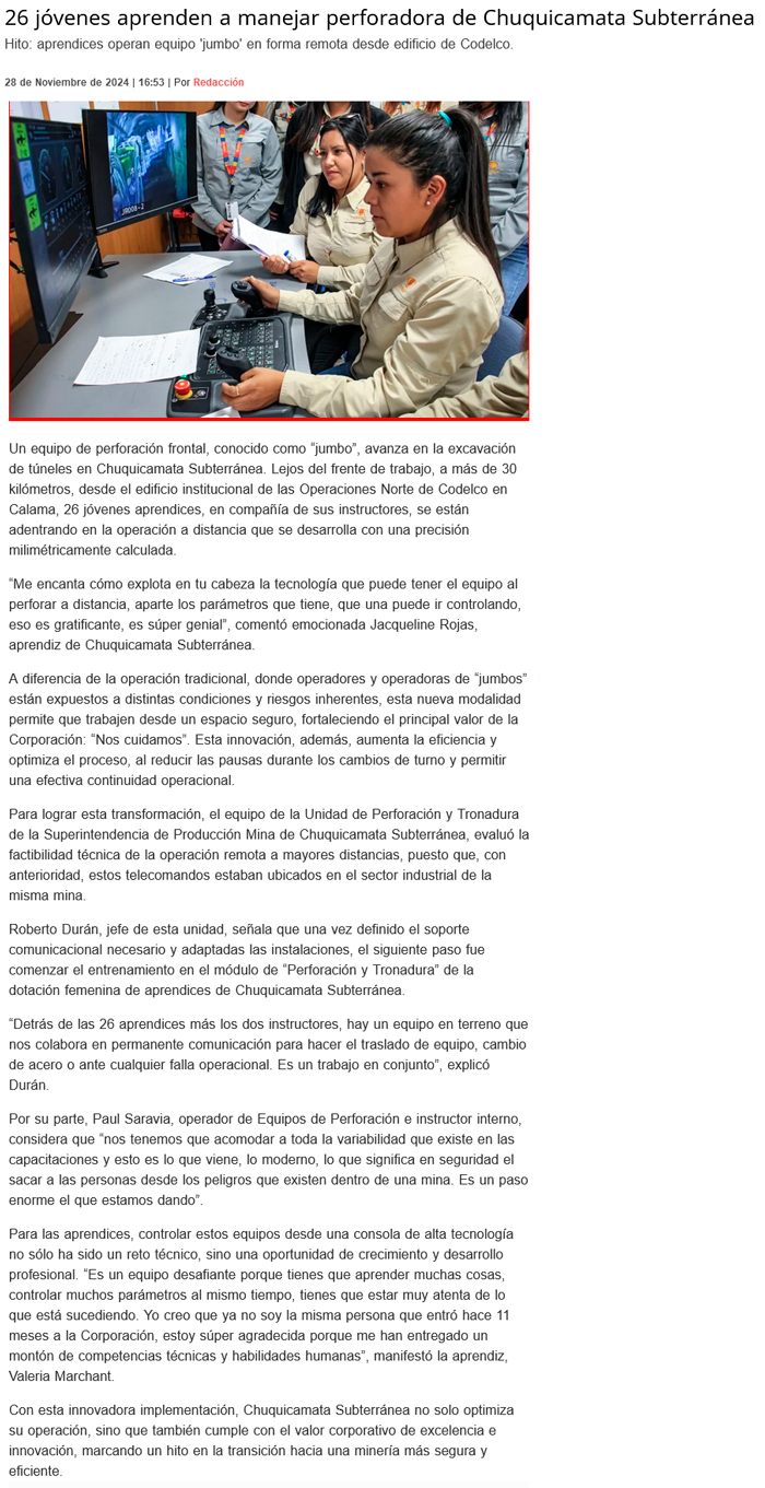 Jóvenes operarán los "Jumbo" en la excavación de Chuqui Subterránea - (El Mercurio de Antofagasta)