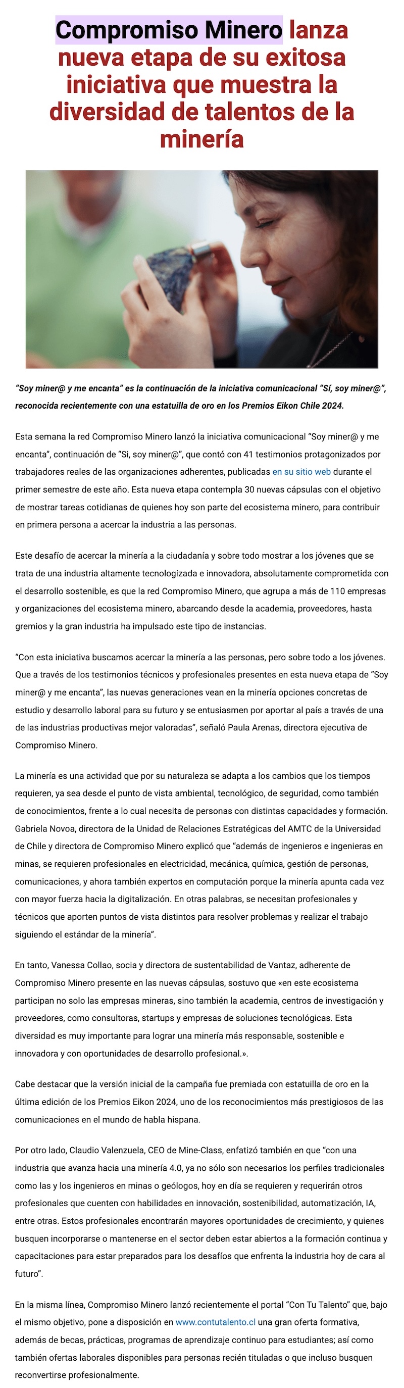 Compromiso Minero lanza nueva etapa de iniciativa que muestra la diversidad de talentos de la minería - (mch.cl)