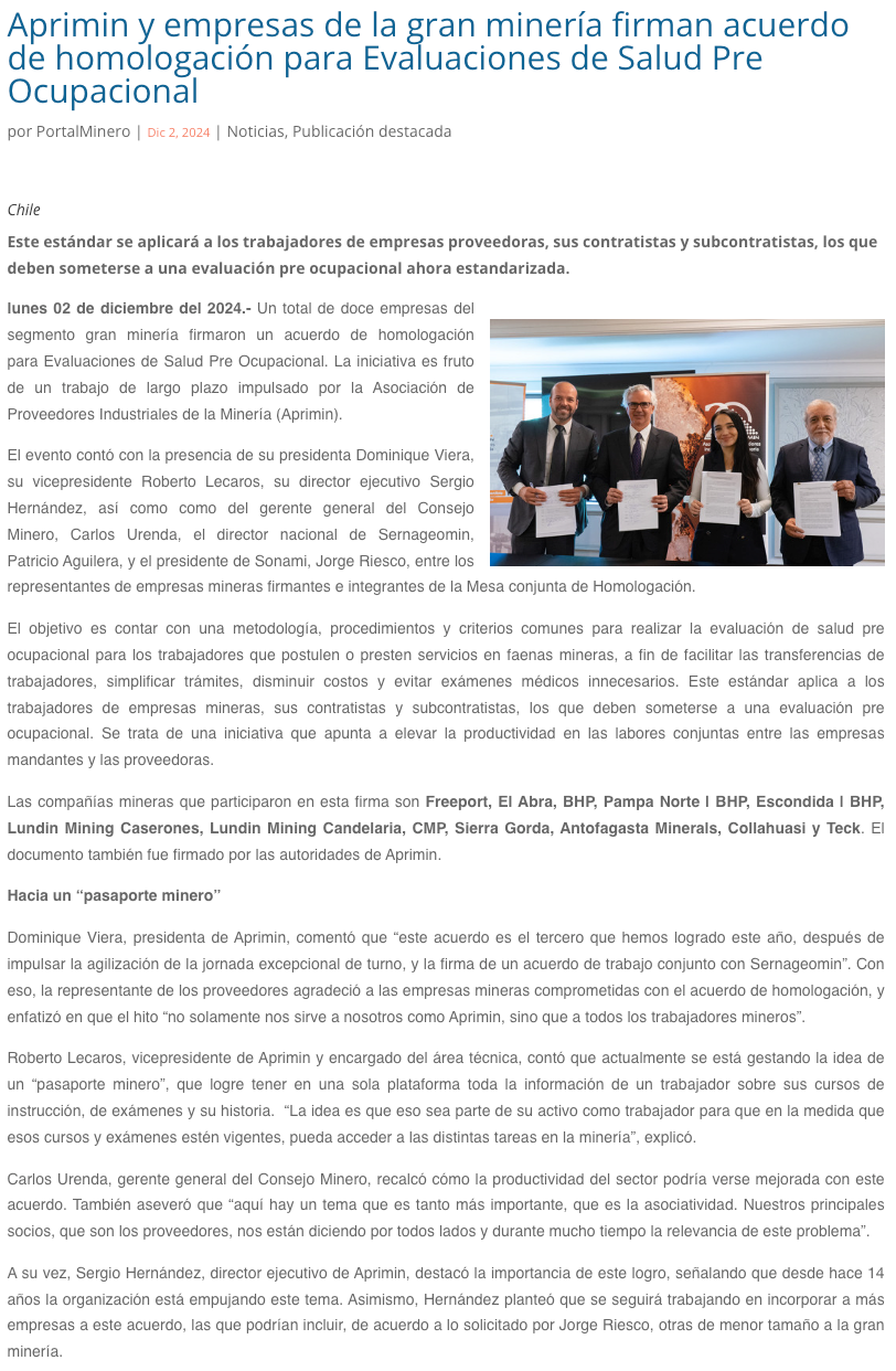 Aprimin y empresas de la gran minería firman acuerdo de homologación para Evaluaciones de Salud Pre Ocupacional - (tierramarillano.cl)