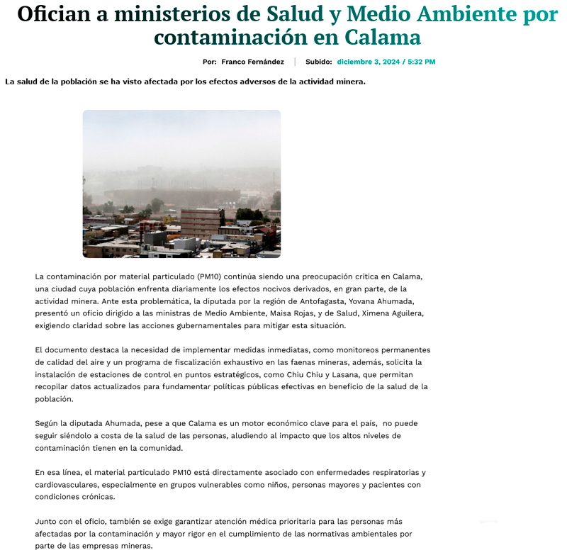 Diputados ofician a Medio Ambiente para conocer estado de avance del PDA de Calama - (El Mercurio de Calama)
