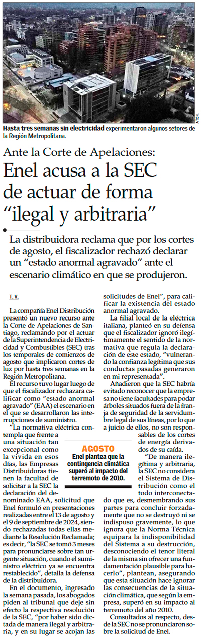 Enel vuelve a llevar a la SEC a tribunales: insiste que "temporal huracanado" de agosto fue un evento inédito - (Pulso)