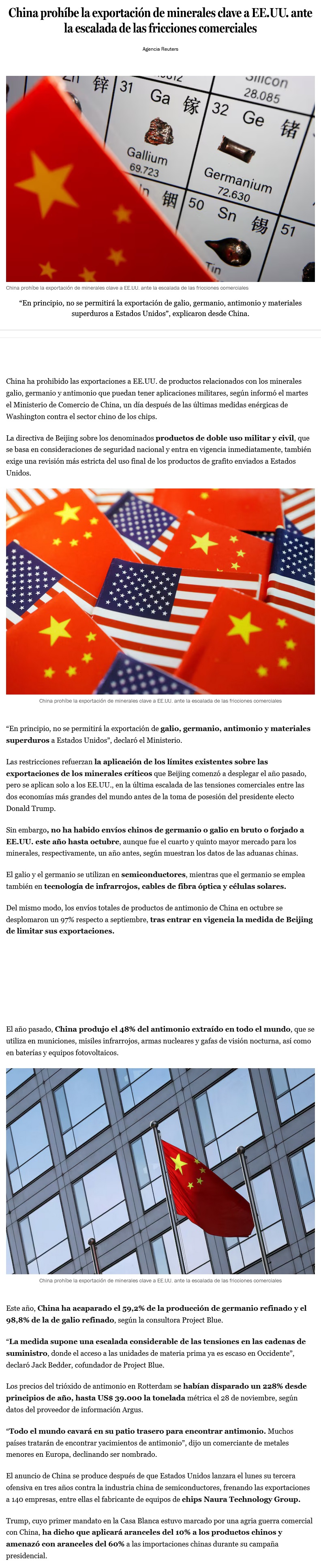 China limita exportación de metales a EE.UU. en respuesta a restricciones tecnológicas - (El Mercurio de Santiago)