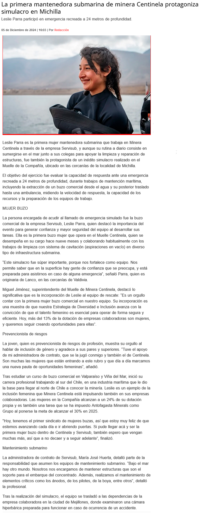 El muelle de Minera Centinela tiene a la primera mujer mantenedora submarina - (El Mercurio de Antofagasta)
