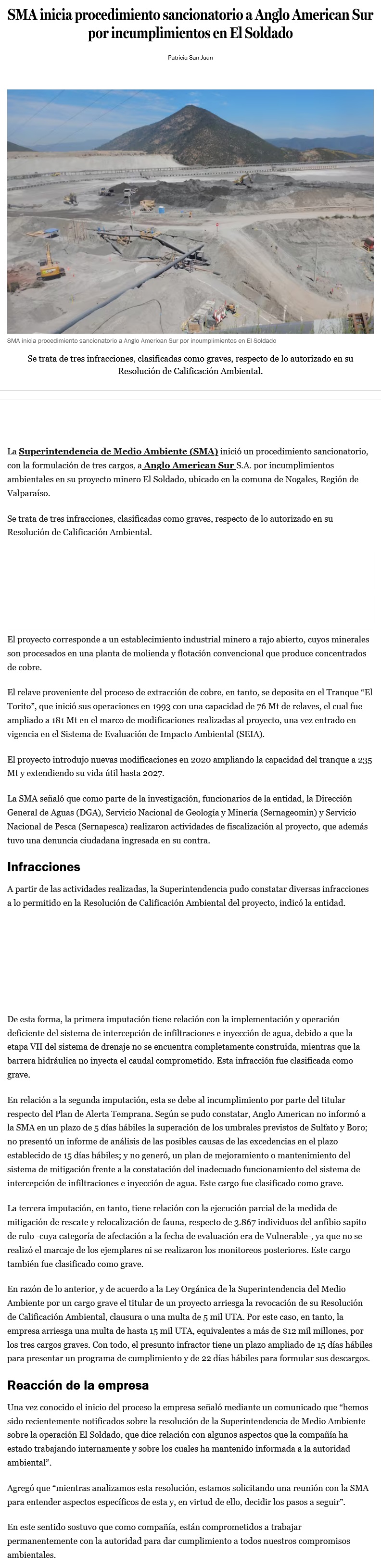 SMA formula cargos contra Anglo American y señala que tuvo tres incumplimientos "graves" en El Soldado - (biobiochile online)