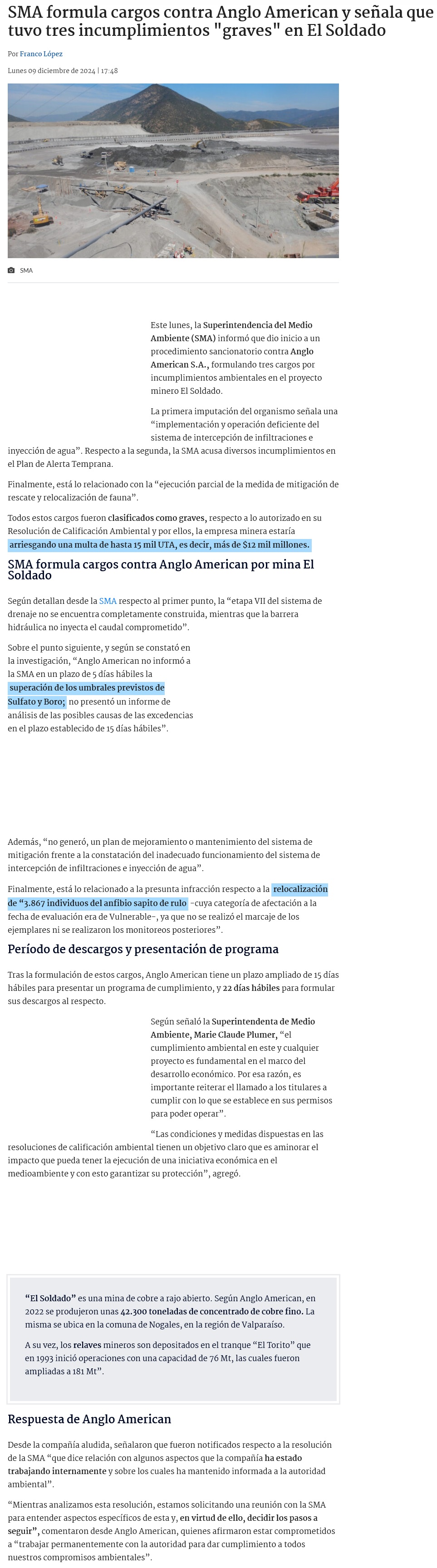 SMA inicia procedimiento sancionatorio a Anglo American Sur por incumplimientos en El Soldado - (La Tercera Online)