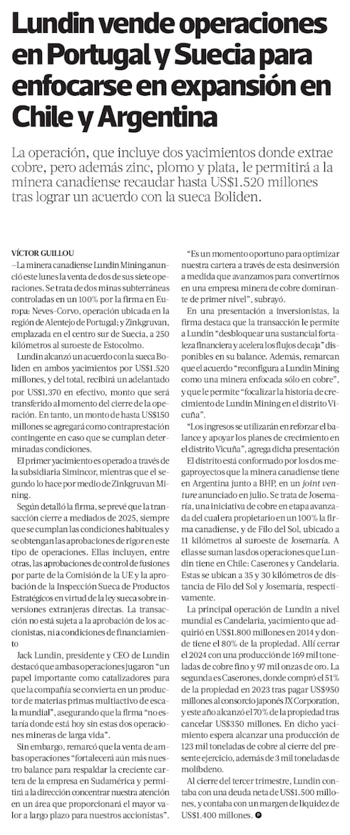 Lundin vende operación en Europa y reforzará negocio en Chile - (El Mercurio de Santiago)