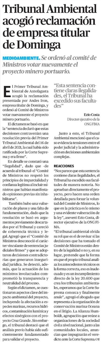 Tribunal Ambiental falla a favor de Dominga y cuestiona con dureza al Comité de Ministros - (El Mercurio de Santiago)
