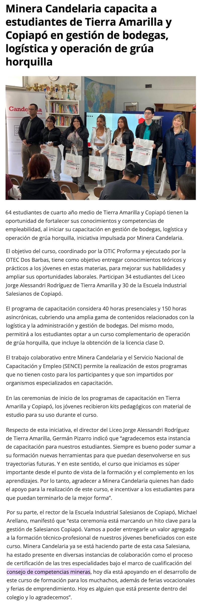 Minera Candelaria capacita a estudiantes de Tierra Amarilla y Copiapó en gestión de bodegas, logística y operación de grúa horquilla - (rtnoticias.cl)