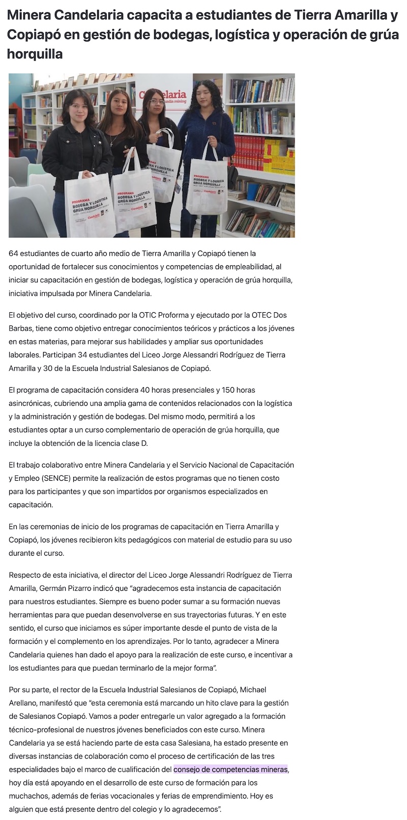 Minera Candelaria capacita a estudiantes de Tierra Amarilla y Copiapó en gestión de bodegas, logística y operación de grúa horquilla - (rtnoticias.cl)
