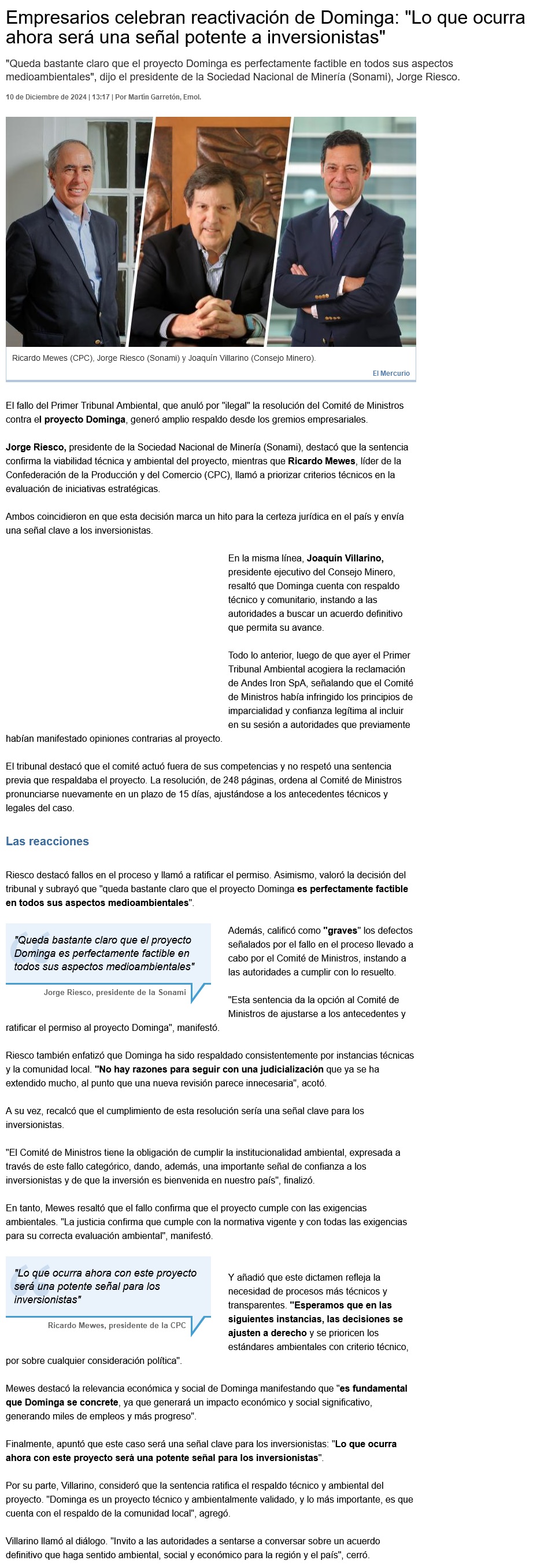 Sonami y fallo de Tribunal Ambiental por caso Dominga: "Queda bastante claro que el proyecto es perfectamente factible" - (soyantofagasta)