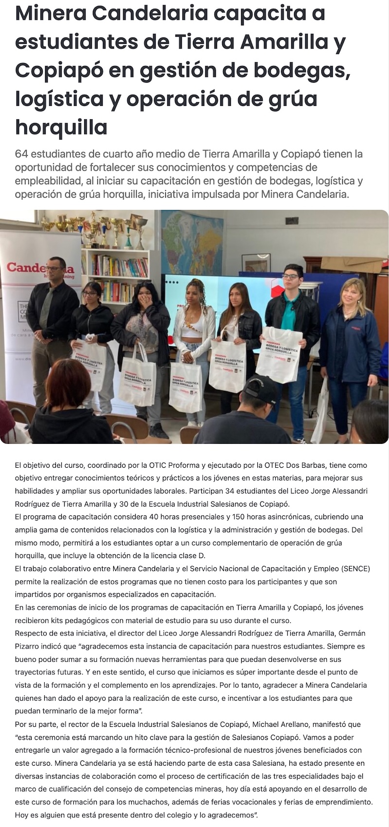 Minera Candelaria capacita a estudiantes de Tierra Amarilla y Copiapó en gestión de bodegas, logística y operación de grúa horquilla - (tierramarillano.cl)
