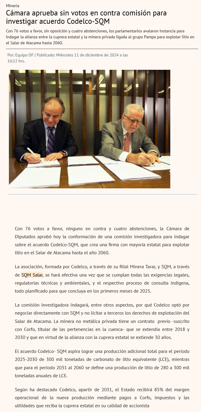 Cámara aprueba crear comisión investigadora por acuerdo entre Codelco y SQM - (La Tercera)